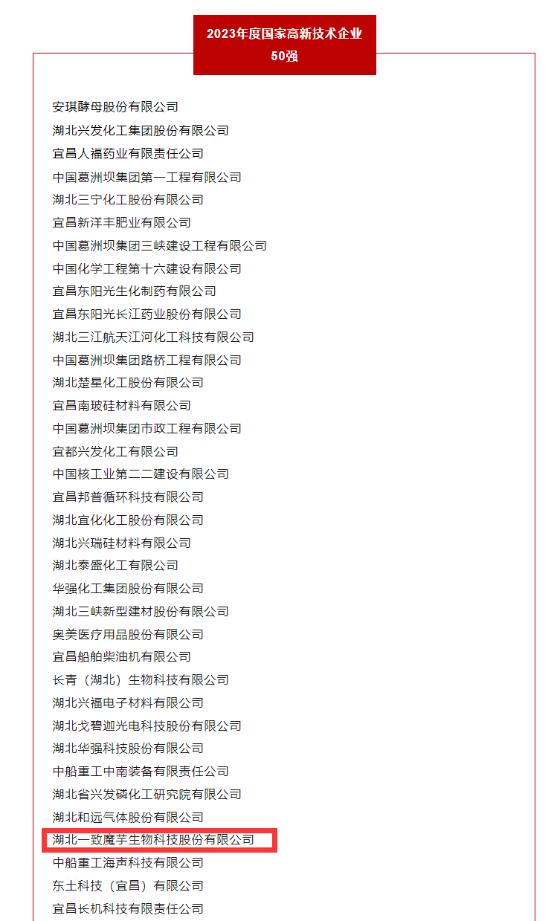 2024年8月2日宜昌市科技大會召開并現場發布了宜昌2023年度國家高新技術企業50強名單。此次發布的年度高新技術企業創新能力50強,是基于2023年度國家火炬統計數據,注重數量規模指標與質量效益指標兼顧,根據創新投入、創新產出、創新潛力等方面共19項具體指標,通過綜合測算,嚴格按總分排序產生。一致魔芋是國家高新技術企業,2020年入選全國專精特新“小巨人”企業,2021年12月入選第七批農業產業化國家重點